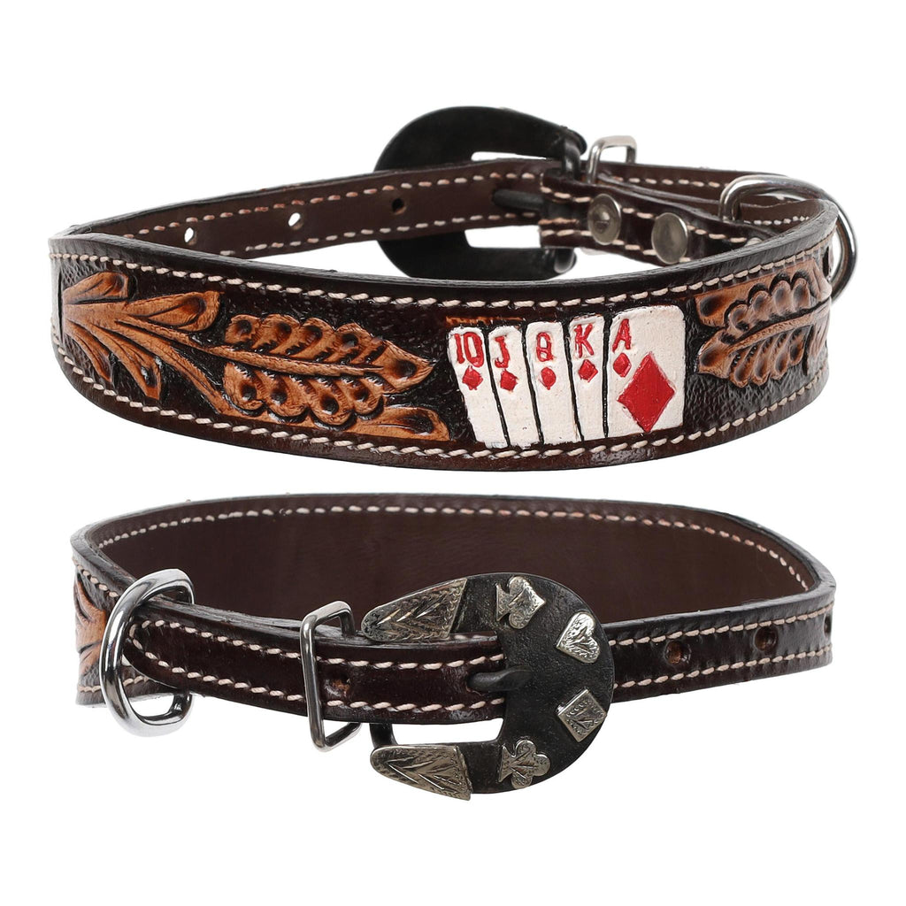 Diamond Flush Leather Dog Collar combines style, durability, and function in one exquisite piece. Crafted from premium chocolate leather, this collar features medium oiled leaf tooling for a beautifully textured surface that catches the eye. The standout feature of the collar is the painted "Diamond Flush" design, which showcases five diamond cards, adding a playful yet sophisticated touch to your dog’s wardrobe. This collar is perfect for pet owners who appreciate intricate details and want to showcase their dog’s unique personality.