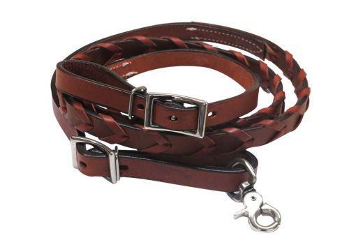 Pony/Youth 6ft x 3/4" leather laced contest rein.  This rein features medium oiled leather with a laced middle. Rein features Conway buckle ends with one scissor snap.