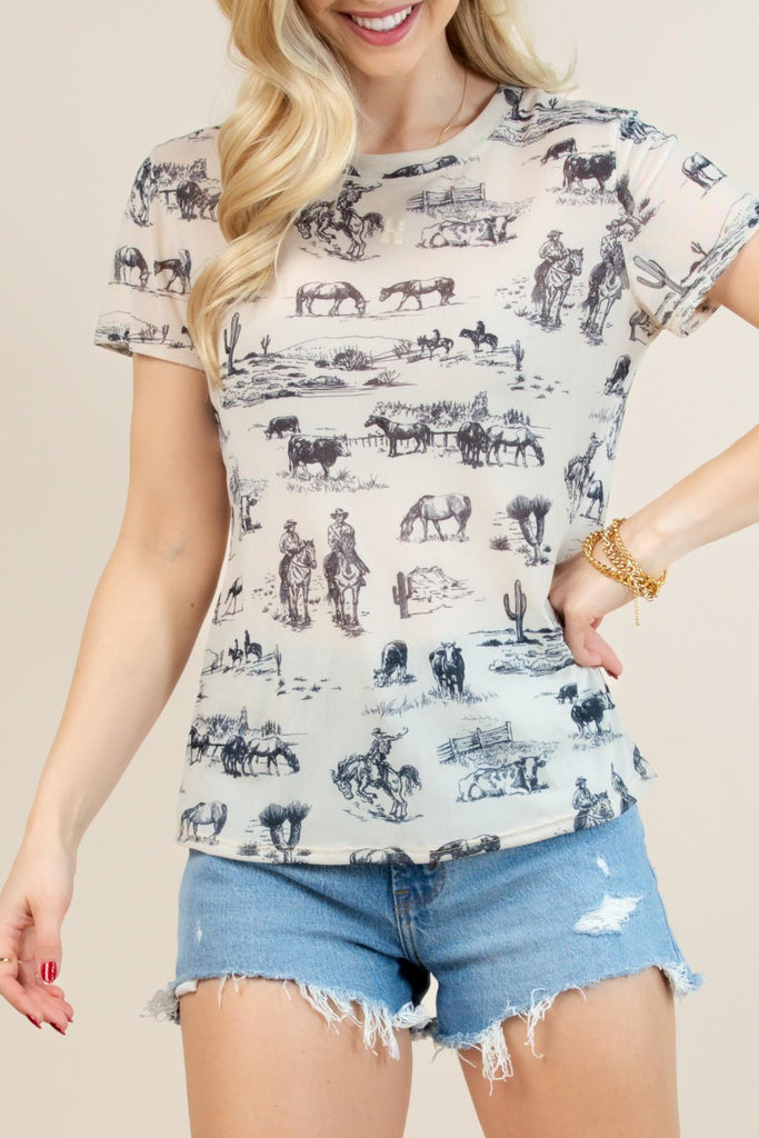 Western Farm Life Mesh Print -Vacation, Beach, Independence Day Top -Print Mesh Fabric, Short Sleeves -Classic Basic Style Tee