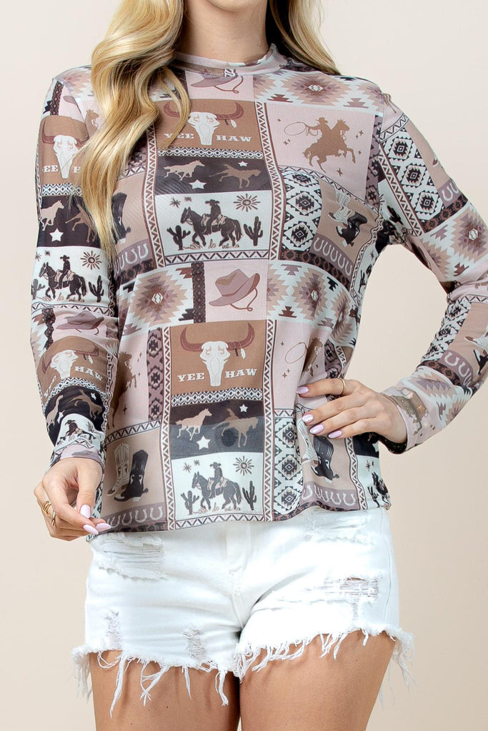 Western Patch Collage Print On Mesh Fabric - Mock Neck - Fall, Inner Top